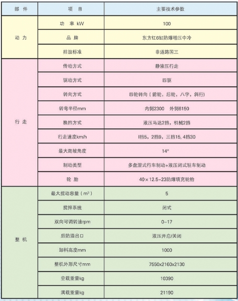 礦用防爆柴油機無軌膠輪車/混凝土攪拌運輸車主要用于煤礦井下巷道中作業(yè),具機動性強、體積小,車身窄、高度低等特點,能同時完成攪拌和運輸作業(yè)。該車以防爆柴油機為動力,具有維護方便、性能等特點。該車采用靜液壓傳動方式,傳動效率高、油耗低、簡單可靠;該整車結(jié)構(gòu)新穎、性能優(yōu)良、運輸效率高,是大中型煤礦及有瓦斯和粉塵爆炸危險環(huán)境的混凝土攪拌輸送車產(chǎn)品之一。具體特點有: